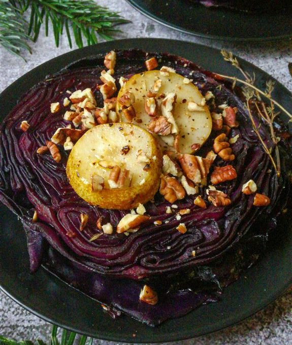 1. Ofen auf 200 Grad vorheizen. Rotkohl abwaschen Strunk entfernen und in zwei bis drei cm dicke Scheiben schneiden und auf ein Backblech legen. Die Zwiebel achteln, den Knoblauch in dünne Scheiben schneiden und auf dem Rotkohl verteilen.